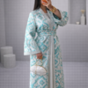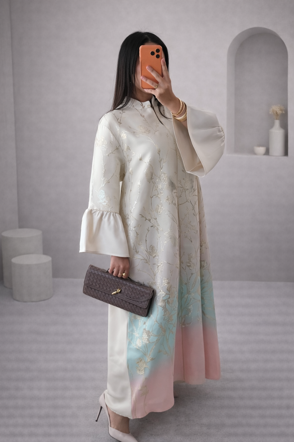 Abaya fluide avec motifs floraux dorés et dégradé pastel, élégante et raffinée. ✨