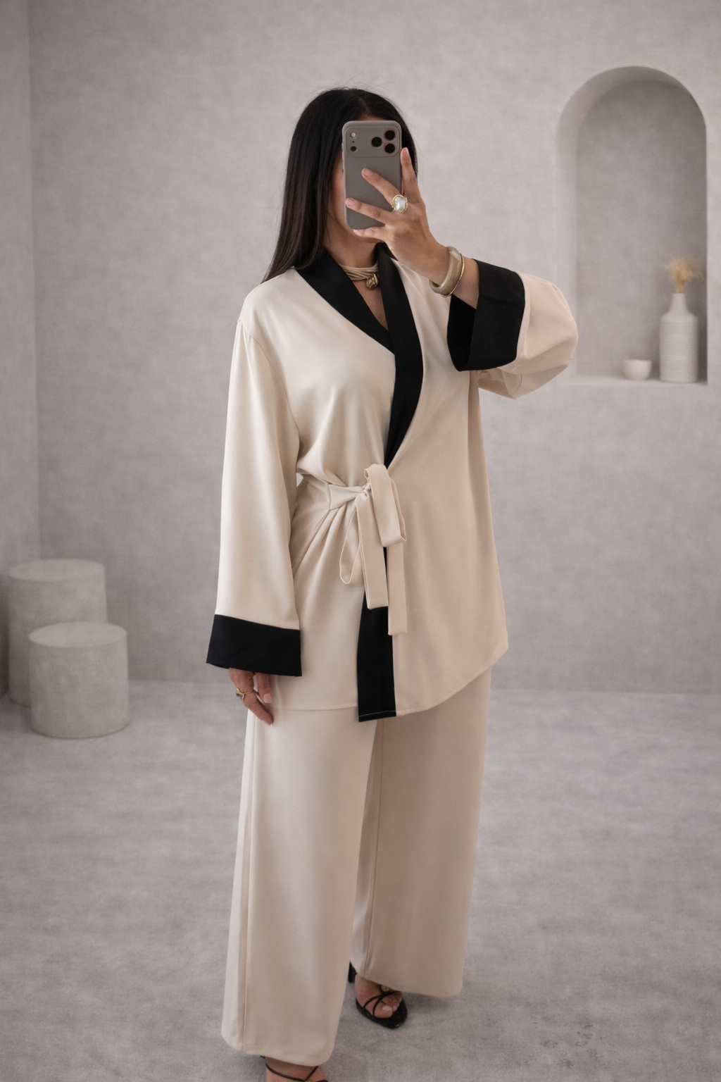 Ensemble fluide et élégant avec détails contrastés noirs et ceinture à nouer, parfait pour un look chic et moderne. ✨